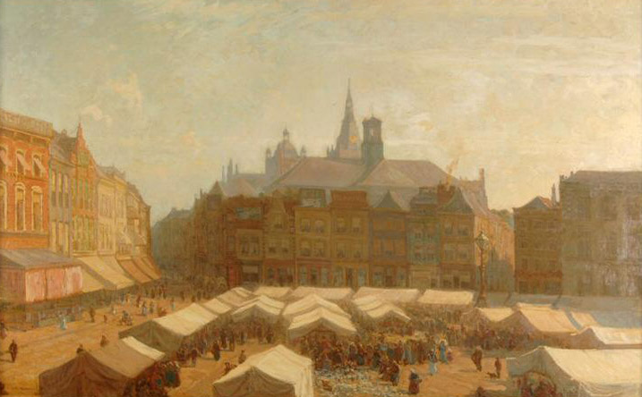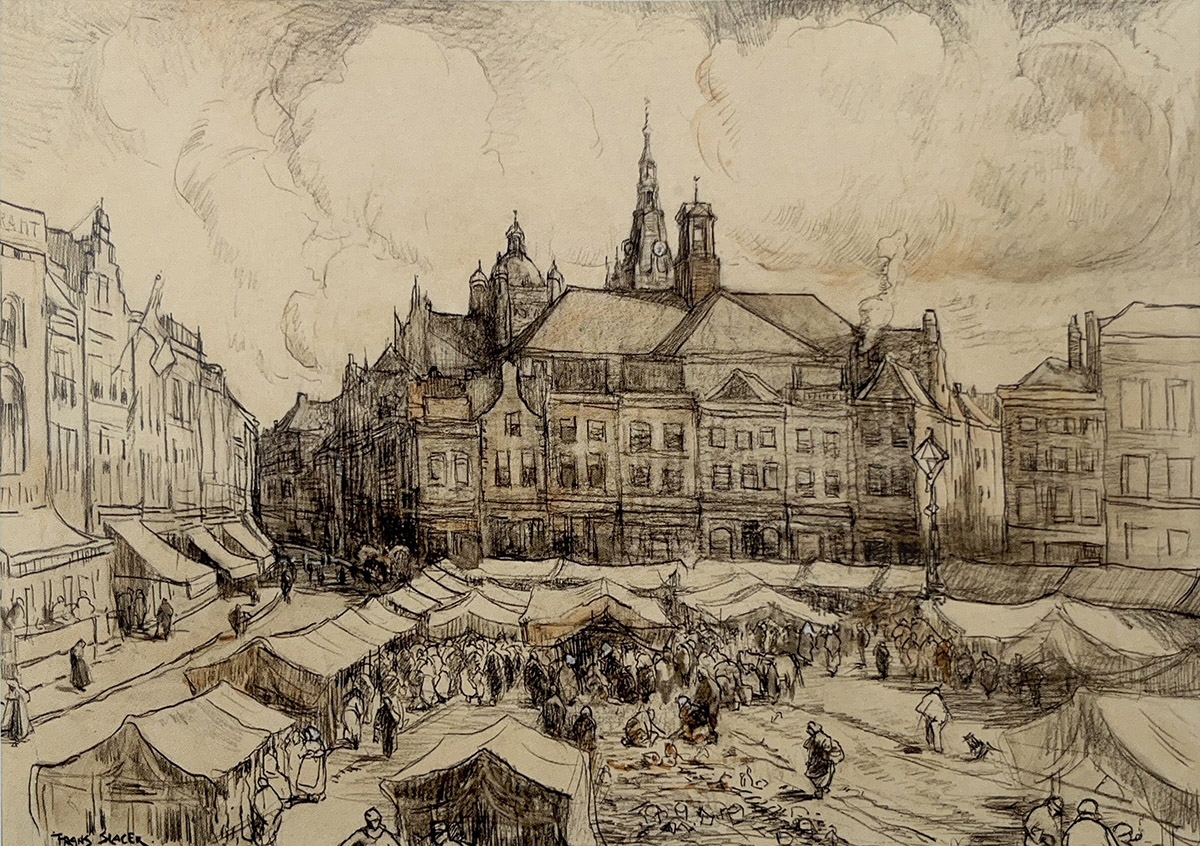 Tentoonstellingscatalogus3. Studie van het Marktgezicht. Zwartkrijttekening door Frans Slager (1876-1953), 47 x 69 cm. (Bruikleen: Gemeente 's-Hertogenbosch.)