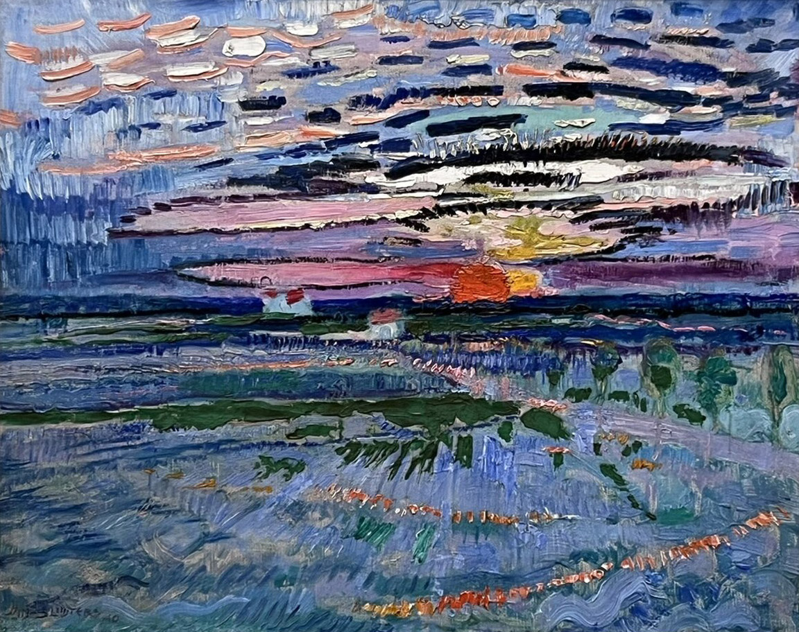 Een kleurexplosie! Alsof een kanon met felgekleurde verf is afgevuurd op het doek. Sluijters schildert het tijdens een tweejarig verblijf in Laren. Zijn intense beleving van het ochtendgloren heeft hij uitgedrukt in de pure kleuren van de zon. Het schilderij staat bol van bezieling en expressie. |