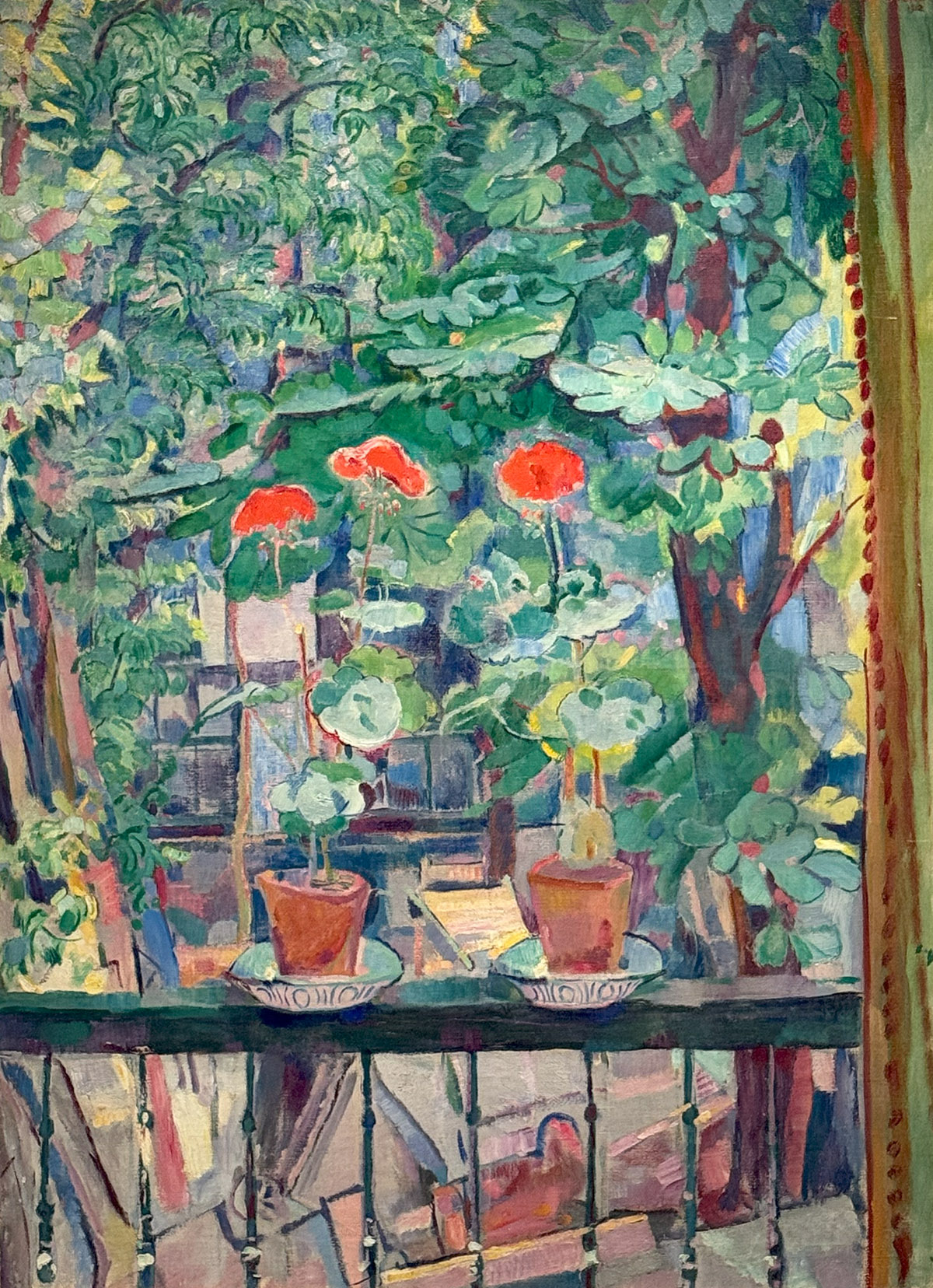 Dit uitzicht vanaf een balkon schilderde Sluijters in zijn woning aan de Bloemengracht in Amsterdam. De invloed van het kubisme is zichtbaar. Sluijters maakte met deze stroming kennis toen hij in 1911 naar Parijs reisde. De geraniums en de balustrade geven houvast in het spel van lijn en kleur.