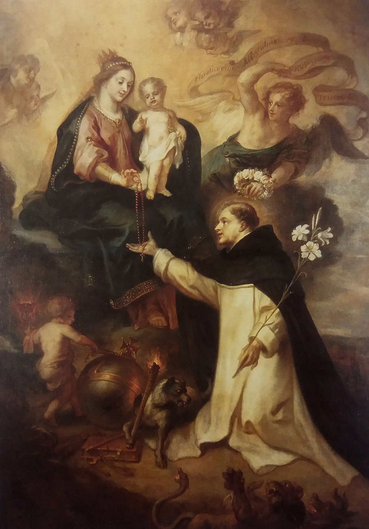 De Dominicanen of Predikheren dragen in de zuidelijke Nederlanden van de 17e eeuw hun naam met ere. Zij verbinden apostolische werkzaamheid aan goed onderhouden kloostertucht. Met krachtige hand werd deze bevorderd door de bosschenaar Michaël Ophovius (1570-1637). De verbreiding van het rozenkransgebed was de Nederlandse predikheren bijzonder dierbaar. Het verhaal van Dominicus, die van Onze Lieve Vrouw het rozenkransgebed geleerd had, zette zich vast in de fantasie van de gelovigen. Dit schilderij is het altaarstuk uit de voormalige schuilkerk aan de Vughterstraat, die bediend werd door de predikheren. |