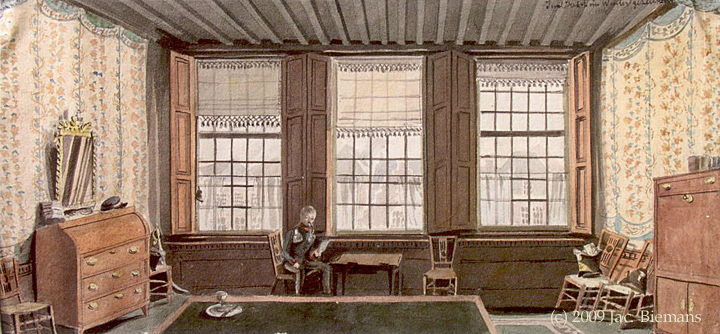In de winter van 1816 tekende August von Bonstetten dit interieur van een van de ruimten in de Hoofdwacht (het huidige Hotel Central) aan de Markt. In het midden een pijprokende militair, links en rechts op de stoelen diverse militaire hoofddeksels. | 170 |