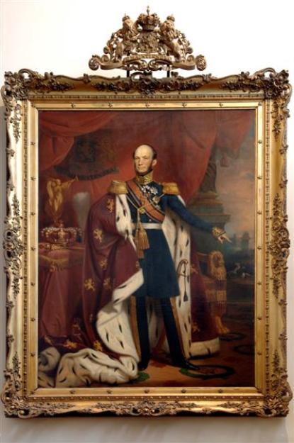 De Schilderij, is met de vergulde prachtige Lijst (waarboven 's Rijks Wapen prijkt), 9 voet hoog en 8 voet breed. -- Zijne Majesteit is voorgesteld in groot Konings kostuum, gelijk bij de Inhuldiging in 's Rijks Hoofdstad; ter zijde liggen Kroon en Scepter; daarnevens staat de Faam op den wereldbol geplaatst; aan 's Konings linkerhand doet zich, in 't verschiet, 's Rijks Zee- en Landmagt voor. De Koning heeft den linker wijsvinger derwaarts heengestrekt.