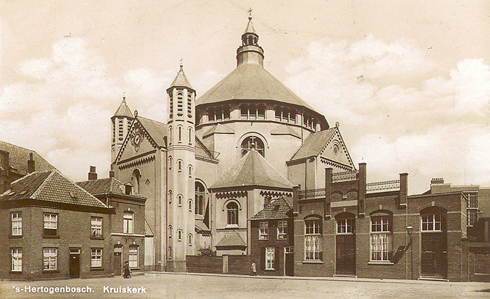 Carnaval is weer voorbij. Gisteren was het aswoensdag. Maar hoeveel mensen zijn er gisteren in de kerk geweest om een askruisje te halen? Laten we daarom vandaag maar eens een kijkje gaan nemen bij een kerk. Het is de St.-Catharina of Kruiskerk - die nu in de steigers staat - aan het Kruisbroedershof. Een aantal Bogarden die in de 15e eeuw hun klooster in de Verwersstraat hadden waar nu het Gouvernement, het Noordbrabants Museum staat, wilden volgens een strengere levensregel leven en verzochten in 1468 om tot de Orde der Kruisheren toe te mogen treden. Dat werd hen toegestaan. Kruisheren en Bogarden in één klooster werd echter geen succes en al spoedig onstond er een strijd over het eigendom. Rome besliste al in 1469 in het voordeel van de Bogarden en daarom moesten de Kruisheren een nieuwe huisvesting zoeken. Uiteindelijk vonden ze die in de omgeving van wat nu naar hen Kruisbroedershof en Kruisbroedersstraatje heet. In 1533 begon men daar met de bouw van een kloosterkapel, toegewijd aan de heilige Catharina. Toen de St.-Cathrien in 1569 parochiekerk werd, bleek zij al spoedig te klein. Van 1601 tot 1609 werd zij verlengd en van een zijbeuk voorzien. De kerk had erg te lijden van het beleg van de stad door Frederik Hendrik in 1629. Toen de kruisheer Antonius van Erp in het koor zat te bidden, trof een bom de kerk en men had grote moeite de stukken van het verminkte lijk te verzamelen. In 1650 namen de hervormden de kerk in gebruik. Omdat zij een kleine gemeenschap vormden, was het onderhoud heel moeilijk. De hervormden moesten op hun beurt de kerk in 1794 verlaten. De Fransen waren ons land binnengetrokken en de kerk kwam in gebruik als militaire bakkerij, paardestal en opslagplaats van hooi en stro. In 1809 gaf koning Lodewijk Napoleon bevel dat het gebouw weer als kerk in gebruik genomen moest worden. Ze werd echter niet gebruikt door de parochianen, maar door het Franse garnizoen. Officieel werd de St.-Catharina weer aan de katholieken toegewezen door keizer Napoleon op 8 december 1810. Maar de kerk was vervallen en bleek te klein. In 1842 vond de aanbesteding plaats voor de bouw van een nieuwe kerk naar een bouwplan van Jos de Kroon. Het vierzijdig gesloten koor van de oude kerk, dat over de Binnendieze heen was gebouwd, bleef gehandhaafd. Erg deugdelijk was deze nieuwbouw in de zogenaamde Waterstaatstijl niet. De kosten voor herstel werden ieder jaar hoger. In 1913 ontstond het plan een nieuwe kerk te bouwen. Architect Jan Stuyt kreeg de opdracht en op 13 mei 1918 werd de kerk geconsacreerd door mgr. Diepen. Voor het ontwerp van de St.-Cathrien had Jan Stuyt zich laten inspireren door de Byzantijnse bouwkunst; wellicht omdat zijn moeder Roemeense van geboorte was. De koepel was een waagstuk voor die tijd. Zij bestaat uit gewapend beton. De overspannning van 22 meter was de grootste van die tijd. Ook nu weer moest het gotisch koor bewaard blijven. Hierdoor werd het priesterkoor erg lang. Zou het altijd helemaal achteraan geplaatst worden, dan zou een deel van de gelovigen er geen zicht op gehad hebben. Daarom werd het orgel met het zangkoor hier opgesteld en kwam het hoofdaltar meer naar voren te staan. Nu is er van de buitenkant niet veel van de kerk te zien. Na de St.-Jacob in de Hinthamerstraat is de Kruiskerk aan de beurt voor een grondige restauratie. Hierna zal men weer volop kunnen genieten van dit monumentale gebouw, waar ook binnen veel te bewonderen valt. Zoals van de negen grote schilderijen van Pieter Jozef Verhagen (1728-1811), afkomstig van de Belgische Abdij van Averbode. |
