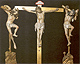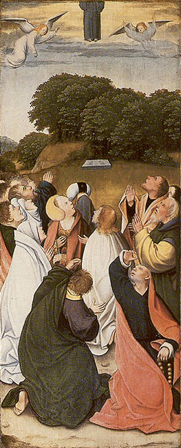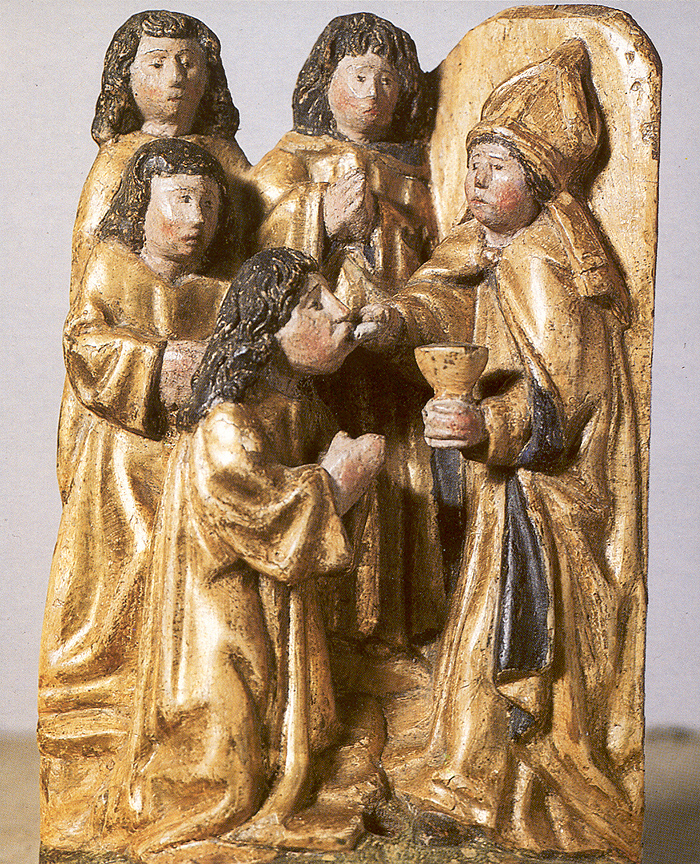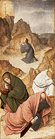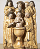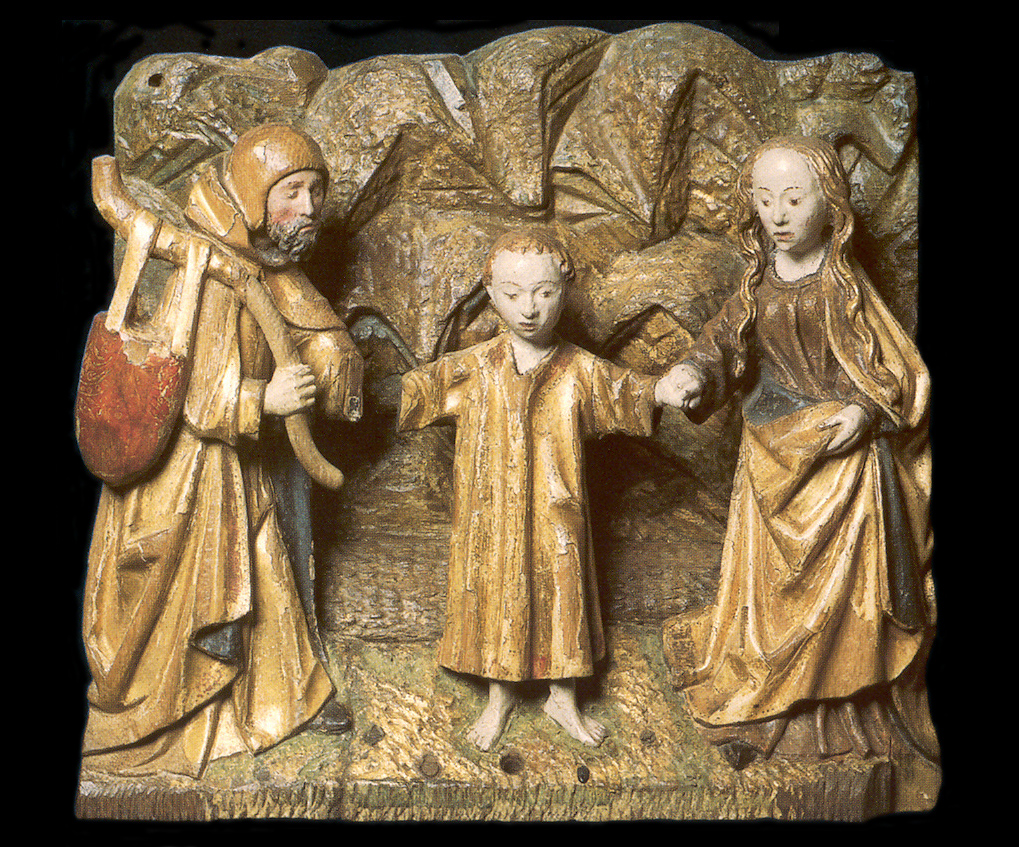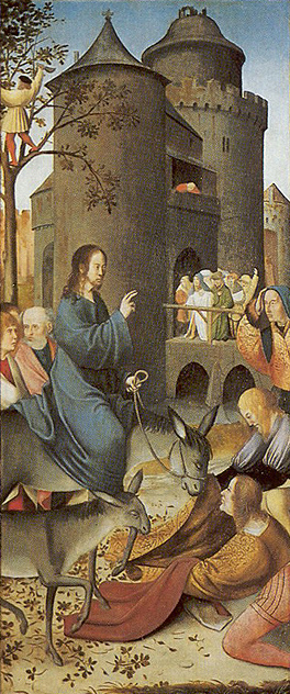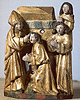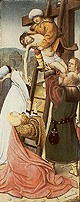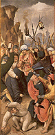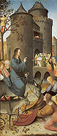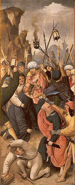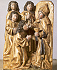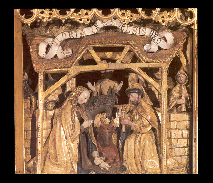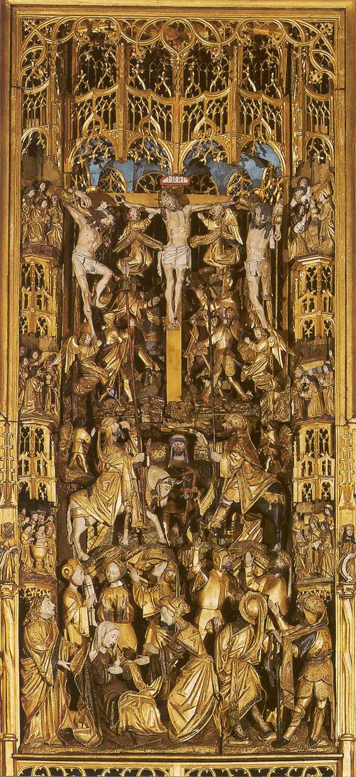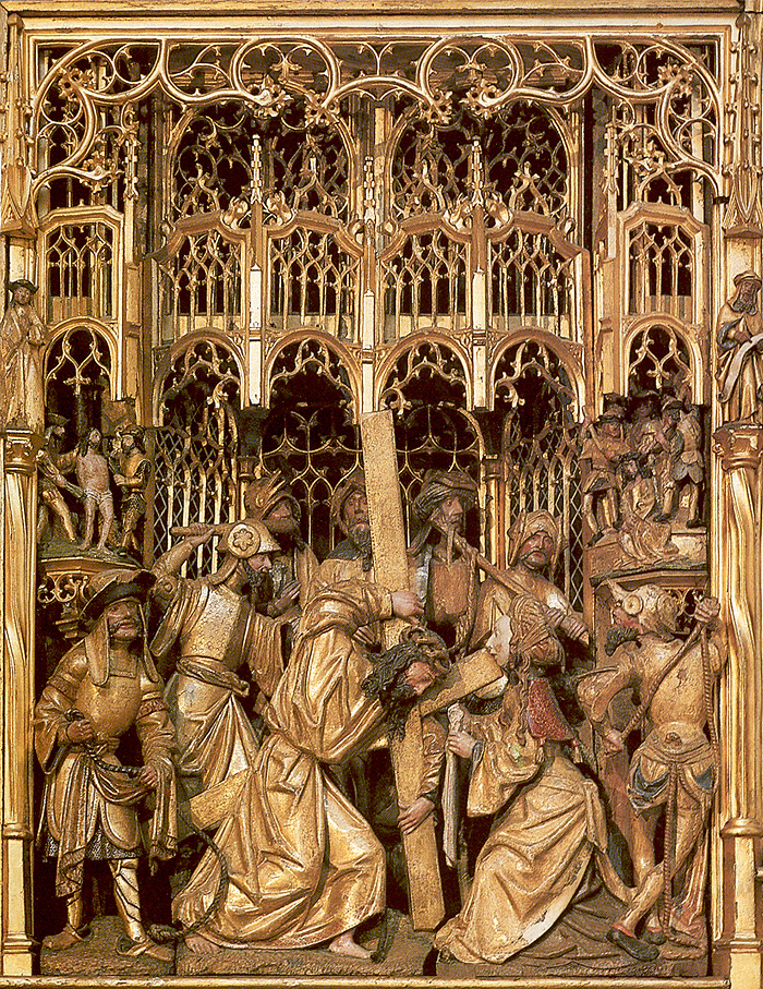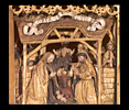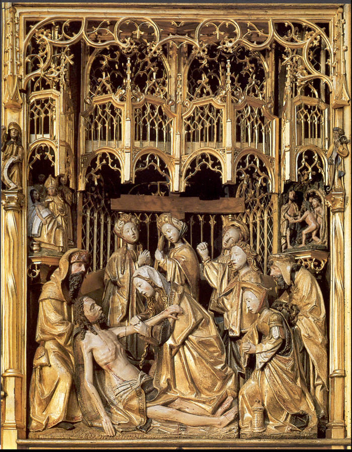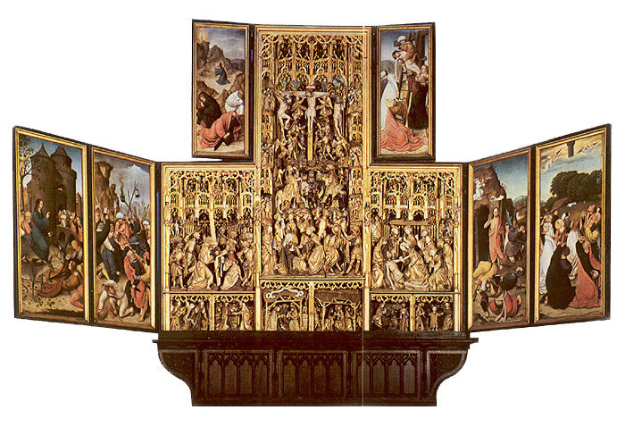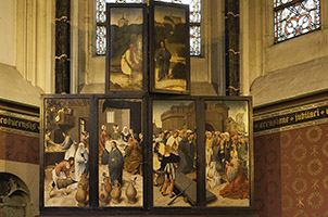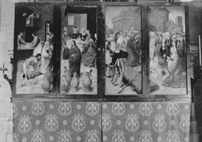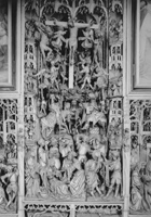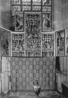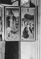 rond de hoofdvoorstelling: doopsel, communie, huwelijk, priesterschap, biecht en vormsel. Het H. Oliesel bevindt zich rechts naast de bewening. Vier kleine figuurtjes op de omlijsting van de compartimenten kunnen misschien geinterpreteerd worden als profeten. De beschilderde luiken geven in gesloten toestand voorstellingen uit het begin van Christus' openbare leven: bekoring in de woestijn, bruiloft van Cana en opwekking van Lazarus. Geopend vormen zij een aanvulling op de passiescenes: intocht in Jerusalem, hof van Olijven, gevangenneming, kruisafneming, verrijzenis en hemelvaart. | 68 |