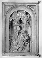 De rijk versierde kast waarin de figuren zijn geplaatst, heeft een vorm die ook in de schilderkunst van de vijftiende eeuw vaak werd gebruikt en waarin een ruimte wordt gesuggereerd die als het ware uit twee onderdelen bestaat. Enerzijds is daar de ruimte waarin de figuren staan, architectonisch uitgebeeld door gotische blindvensters in de achterwand en een overkragend baldakijn aan de voorkant. Daarvoor is een rondboog geplaats die geen deel uitmaakt van de ruimte waarin de figuren staan, maar die een soort omlijsting vormt.