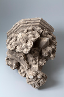 dat de kraagsteen is hergebruikt, of in elk geval in eerste instantie niet voor deze plek bestemd was. Boven de kraagsteen is opnieuw een baldakijn uit de bouwtijd bewaard, waarnaast twee kleinere kraagstenen zijn geplaatst. De linker ervan (k40a) heeft fijn krullend koolbladwerk dat voortkomt uit een schotel waar aan de onderzijde een zittende leeuw is afgebeeld. Een gipsafgietsel van deze leeuw is | 155 |
