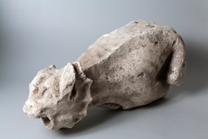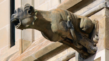 Een tweede spuwer van het torentje was bewaard op de zuidoosthoek. Hiervan bleef niet het origineel maar slechts het gipsafgietsel bewaard in de bouwloods. De spuwer heeft een monsterkop met wijd open gesperde bek, spits omhoogstaande oren, bolle ogen en dikke wenkbrauwen. Opmerkelijk is de kiewachtige drakenkraag rond de kop. In tegenstelling tot de andere spuwers aan het torentje die globaal werden gekopieerd, volgde Hezenmans bij de restauratie vrij nauwkeurig dit origineel. | 65 |