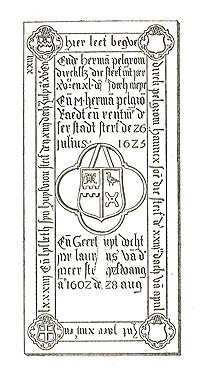 Autre Epitaphe.Hier leyt begraven DIRCK PELGROM DE BYE Henrickxz, sterft den 23. Dagh April 1484. En ELISABETH COENEN syn huysvrou, sterft den 14. Dag July 1523.En HERMAN PELGROM Dircksz., sterft in jaer 1540. den 10. Mey. En Mr. HERMAN PELGROM, Raedt ende Rentmeester deser Stadt, sterft den 26. July 1625. | 36 |