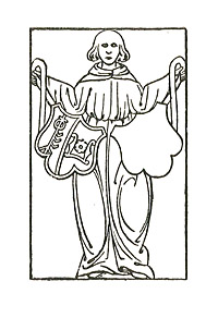 De zerk is ten zeerste afgesleten. Van het onderste deel van de engel zijn nog slechts enkele contouren te zien en ook van de inscriptie in gegraveerde letters is een aantal stukken onleesbaar geworden. De zerk heeft een tekstband, waarvan de hoeken worden onderbroken door cirkels met daarin in reliëf de evangelistensymbolen. De laatste datum, mogelijk later aangebracht, middenboven op het middenveld wordt onderbroken door een hand- of huismerk. Het getal in Romeinse cijfers, aangebracht in de linkerbuitenrand, wordt door Smits geïnterpreteerd als zijnde het einde van de inscriptie in de tekstband; het jaartal op het middenveld bovenaan ziet hij als later toegevoegd. 1.In het midden is een staande rechthoek aangegeven waarin vroeger een staande engel te zien was, die in haar twee uitgespreide handen twee wapenschilden vasthield aan een lint. De engel was gekleed in een albe, bloezend over een gordel, en een schouderdoek.