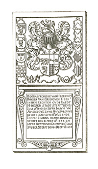 Autre Epithaphe.BegraevenisseVan Hr. en Mr. ROGIER VAN GRIENSVEN, licentiaet inde Regten, Out Raed deser Stadt, sterft den 21. July 1643. En Juffrou JOSINA VAN AMERZOYE syn huysvrouw, den 15. Juny 1603. En JOHANNA hunne Doghter sterft 21. Maert 1633. En Juffrouw HESTER VAN GRIENSVEN haer Suster, Fondatrice van 't Grinsvenne Gasthuys, sterft den 14. December 1651. Quartiers. Van Grinsven, Van Meerendonck, Van Son, Gruythuysen, Amerzoye, Heeze, Kivits, Kelst. | 37 |