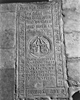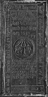 De inscriptie boven de cirkel heeft dezelfde letters als in de tekstband; de tekst eronder is in kapitalen. De laatste sterfdatum is niet ingevuld, of later weggekapt, gezien de beschadiging in het midden onder de laatste regel.