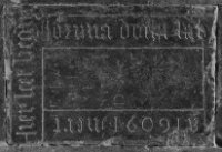 De benedenrand van deze kleine zerk is verdwenen. De inscriptiezerk heeft een tekstband die wordt voorgesteld als zijnde omgeslagen op de hoeken. De oorspronkelijke inscriptie bevindt zich in de tekstband; de inscriptie op het middenveld is duidelijk later aangebracht.