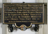Autre Epithaphe.Sepultura.Domini ANTHONII BRUYNINCX, S. Th. Lic. Ecclesiæ hujus dum viveret Præsbiteri, & Episcopatus Diaconi, qui Sacerdotio & residentia jubilarius, plenus dierum, & in senectute bona, videlicet natus Ao. 84. in Domino moritur Ao. 1623. mensis vero Junii die 16. In pace in idipsum dormiat & requiescat. | 43 |