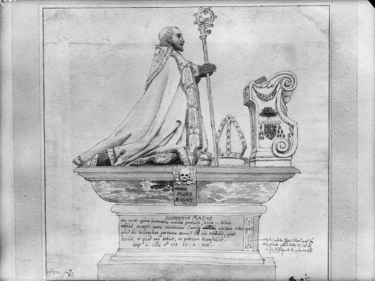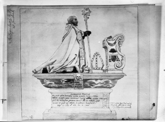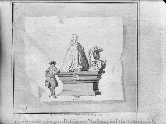 Frontale blik op het praalgraf dat hier nog volledig intact lijkt: handen, mijter en staf zijn nog aanwezig. Onder de tombe staat de tekst: ”Gisbertus Masius. Hic iacet: quem bommelia mundo protulit, ducis Silva insula excepit, mors virtutibus Canisq(ue) aucum (geschrapt) auctum intercepit. quid hic triumphas germana somni? ille tibi reddidit quod debuit; et quod | 48 |