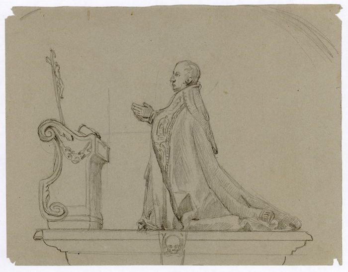non debuit in patrium transtulit. obiit ii iulii Ao MDCXIV". Op de sarcofaagvormige tombe: "Omnia mors aequat". Rechts naast de basis: "Aen de ander sijde was oock soo een punt als dit is; is bij mijn versuym te maecken". Links onder staat de datering, 30 juni 1632. Op grond van de stijl en schrift wordt de tekening toegeschreven aan Saenredam die van 29 juni tot 3 juli in Den Bosch logeerde, vermoedelijk bij zijn oom de predikant Johannes Junnius. | 50 |