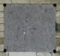 De steen is tegen de muur vastgezet met vier ronde ijzeren klampen op de hoeken. Hij bevat alleen de zevenregelige inscriptie.