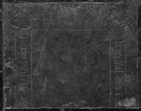 Het betreft het bovengedeelte van een zerk. We zien een tekstband met nog twee hoekvierpassen met daarin evangelistensymbolen. In het midden zijn de onderste lijnen te ontwaren van wat vroeger een kelk met hostie in een cirkel moet zijn geweest.