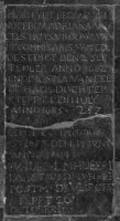 Er loopt een breuk over het midden van de zerk. De eerste helft van de inscriptie vertoont mooie kapitalen. De kapitalen van de tweede helft van de inscriptie zijn op een wildere manier gegraveerd en zijn ook veel vager geworden.