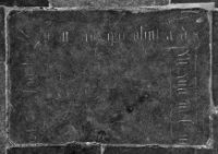 Het betreft het onderstuk van een zerk met een tekstband die op de hoeken is voorgesteld als zijnde omgeslagen.