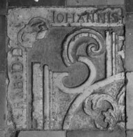 Het betreft de rechterbovenhoek van zerk 212. De oorspronkelijke hoekvierpas hier, met nog een gedeelte van een engel als symbool van de evangelist Johannes, is weggekapt.