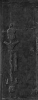 De zerk, die tot midden 2009 gedeeltelijk onder de daar toen aanwezige informatiebalie lag, is over het gehele rechtergedeelte sterk afgesleten. Verder loopt er aan de bovenzijde een schuine breuk van links naar rechts, terwijl ook aan de linkerbenedenhoek een grove en grillige breuk is te zien. De rechterbenedenhoek is verdwenen. De voorstelling is uitgevoerd in graveertechniek met verdiepingen voor opvulling met een ander materiaal, dat nu verdwenen is.