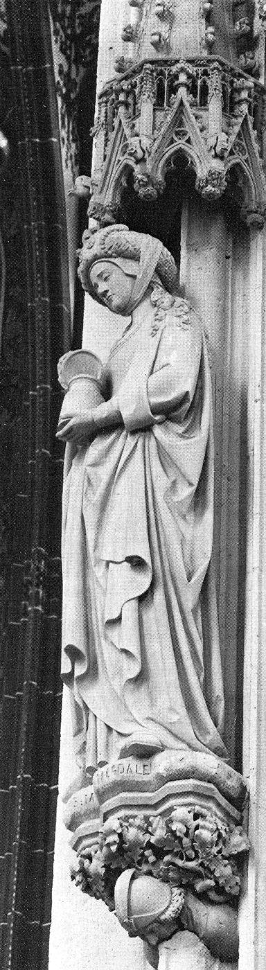 Iconografie: vrouw met loshangend haar en een mondain hoofddeksel, die vroom en bescheiden voor zich uit kijkt. Mara Magdalena, die door Jezus werd genezen van 'zeven duivels', was één van de vrouwen die hem in Galilea volgen en dienden (Lucas: 8,1-2; Marcus: 16,8). Deze Maria was getuige van zijn kruisiging en trof met de twee andere Maria's het lege graf aan na de verrijzenis. Volgens Markus (16,9) was Maria Magdalena de eerste aan wie de verrezen Christus verscheen, waar Johannes (10,11-18) nog aan toevoegt dat de Heer haar een boodschap gaf voor de apostelen. Elders in het Nieuwe Testament komt nog een niet bij naam genoemde zondares voor (Lukas: 7,37) en Maria van Bethanië, de zuster van Lazarus en Martha (Lukas: 10,38-42). De westerse kerk beschouwt sinds Augustinus en Gregorius de Grote deze drie vrouwen als één en dezelfde persoon. De latere in de twaalfde eeuw gevormde legende verhaalt dat Maria Magdalena na Christus' dood naar de Provence trok en daar dertig jaar als kluizenares leefde. Ze zou te Saint-Baume zijn begraven. | 60 |