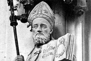 Iconografie: de in pontificaal ornaat gehulde bisschop draagt een korte baard en heeft een kromstaf in zijn rechterhand. In de linkerhand, die met zijn koorkap bedekt is, houdt hij een geopend boek, waarin een afbeelding te zien is van de doornenkroon en de tekst: De liefde Gods. Franciscus werd in 1567 geboren op het Château de Sales in Savoye. Hij studeerde rechten in Annecy, Parijs en Padua, maar koos na enige tijd, ondanks de tegenstand van zijn vader, voor het priesterschap. In 1594 werd hij gewijd. Met succes wist Franciscus achtduizend calvinisten terug te brengen tot het katholieke geloof. In 1602 werd Franciscus gekozen tot bisschop van Genève. Als geestelijk schrijver had Franciscus van Sales grote invloed met zijn geschriften 'Philothea' en 'Theotimus'. Samen met de heilige Johanna van Chantal (zie beeld 40) stichtte Franciscus de orde der Visitatie. Toen hij op 28 december 1622 te Lyon stierf, vonden zijn artsen zijn gal geheel versteend en vele galstenen. Franciscus werd in Annecy begraven. In 1655 werd hij heilig verklaard en in 1877 verheven tot kerkleraar. Paus Pius XI verhief hem tot patroonheilige van journalisten en de pers. | 62 |
