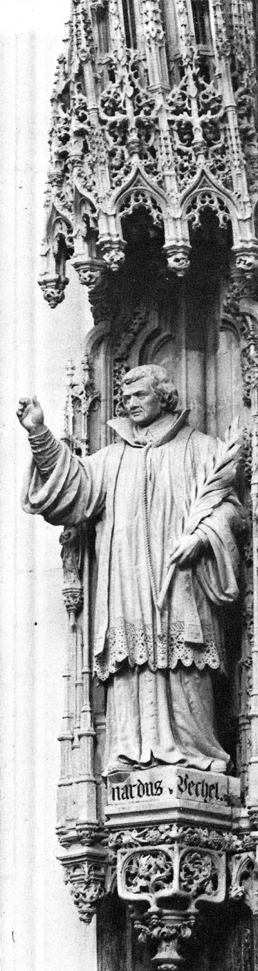 Iconografie: wereldgeestelijke met toga, superplie en stola. Om de hals draagt Leonardus een strop, zijn rechterhand heft hij zegenend op, in de linkerhand heeft hij een palmtak. De heilige Leonardus van Veghel werd in 1527 te Den Bosch geboren in de Postelstraat als zoon van Goyart van Veghel en Ida, dochter van Leonard Arendszn. Leonardus studeerde aanvankelijk in het fraterhuis te Den Bosch en vanaf 1545 te Leuven. Daar vervolgde hij zijn opleiding op het paus-Adriaancollege als theologiestudent onder Ruardus Tapper en viel daarbij op door zijn opmerkelijke studieresultaten. In 1558 kwam Leonardus in Gorinchem om er als pastoor te werken. Vol toewijding legde Leonardus zich toe op zijn parochiale taak, en hij zou als zijn inkomsten aan armen en zieken geschonken hebben. Temidden van het snel opkomende protestantisme bracht hij vele katholieken terug nar hun moederkerk. Leonardus was een van de drie pastoors uit Gorinchem die in 1572 door de watergeuzen in Den Briel werden opgehangen, tegelijk met de andere zogenoemde martelaren van Gorkum, die in 1867 werden heligverklaard. | 128 |