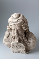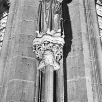 Naast de volgende straalkapel is wederom een drielobbige kraagsteen te vinden (k40). De onderzijde wordt gevormd door een buste met een mannenkop, die een merkwaardige muts of kappertje draagt. Van onder de muts komt kort krullend haar en deman heeft een lange krullende gaffelbaard. De kin en mond van de man verdwijnen achter de pijlerprofilering, waardoor het lijkt of de man in de pijler hapt. In de nek van de man ontspruiten dikke takken van wijnranken, die sterk krullend met veel bladwerk en fijn uitgewerkte druiventrossen het bovendeel van de kraagsteen vormen. Van het onderste deel van de kraagsteen is in de bouwloods een negentiende-eeuws gipsafgietsel bewaard. De schouders van de man onder de kraagsteen lijken te zijn bijgewerkt en ook de wijze waarop de man nu in de pijler hapt wijst erop | 154 |