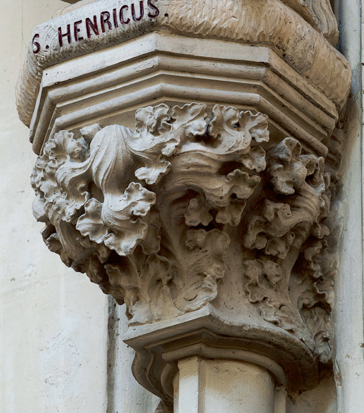 Kraagsteen k46 heeft sterk gestileerde, krullende maar vrijwel symmetrische koolbladeren die voort lijken te komen uit de nekring. Boven het neogotische beeld van de heilige Henricus is een baldakijn uit de bouwtijd bewaard dat grote overeenkomst heeft met dat boven k47. Voor het rijk gehouwen tufstenen baldakijn werden bij de restauratie alleen enkele spuwertjes toegevoegd. De twee kraagstenen aan weerszijden van het baldakijn verschillen sterk; zelfs de profileringen van de dekplaten zijn afwijkend. De linker kraagsteen (k46a), waarvan een afgietsel in de bouwloods wordt bewaard, heeft gestileerde koolbladeren die voortkomen uit een hangende bloem, een zogenoemde Engelse roos.8 De rechter kraagsteen (k46b) heeft ook koolbladeren onder de dekplaat, maar die komen voort uit een vrouwenkopje dat vriendelijk recht naar beneden kijkt. Het haar van de vrouw is gekapt in strengen, die overgaan in de stengels van de sterk gekrulde koolbladeren die de dekplaat ondersteunen. Ook van deze kraagsteen wordt een afgietsel bewaard in de bouwloods.9 | 147 |