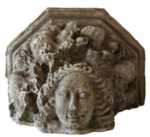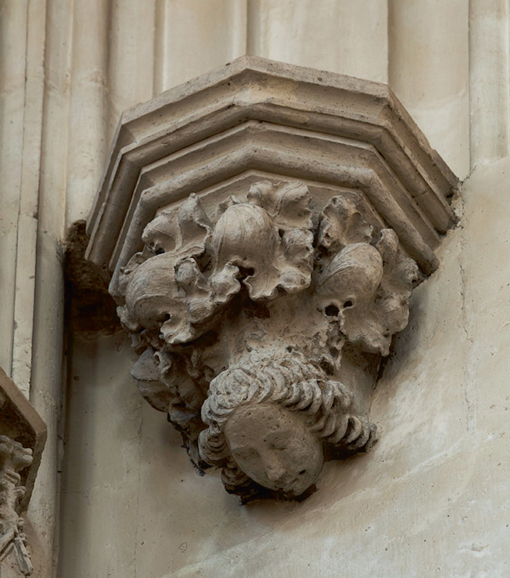 Kraagsteen k46 heeft sterk gestileerde, krullende maar vrijwel symmetrische koolbladeren die voort lijken te komen uit de nekring. Boven het neogotische beeld van de heilige Henricus is een baldakijn uit de bouwtijd bewaard dat grote overeenkomst heeft met dat boven k47. Voor het rijk gehouwen tufstenen baldakijn werden bij de restauratie alleen enkele spuwertjes toegevoegd. De twee kraagstenen aan weerszijden van het baldakijn verschillen sterk; zelfs de profileringen van de dekplaten zijn afwijkend. De linker kraagsteen (k46a), waarvan een afgietsel in de bouwloods wordt bewaard, heeft gestileerde koolbladeren die voortkomen uit een hangende bloem, een zogenoemde Engelse roos.8 De rechter kraagsteen (k46b) heeft ook koolbladeren onder de dekplaat, maar die komen voort uit een vrouwenkopje dat vriendelijk recht naar beneden kijkt. Het haar van de vrouw is gekapt in strengen, die overgaan in de stengels van de sterk gekrulde koolbladeren die de dekplaat ondersteunen. Ook van deze kraagsteen wordt een afgietsel bewaard in de bouwloods.9 | 147 |