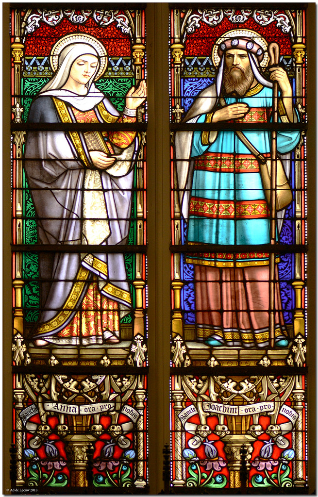 6, 7 en 8. Middenvenster: H. Drievuldigheid, Joachim en Anna, met de onderschriften Sancta Anna ora pro nobis en Sancte Joachim ora pro nobis. Onder elk beider figuren een wapen: 1. Op blauw een gouden vrouwenborstbeeld (Coppens). 2. Op zwart drie gouden heiblokken, 2 en 1 (Suys). Het noordelijke raam: Maria met Kind en Joseph. Onder de figuren in verstrengelde banderollen: Mater Dei ora pro nobis en Sancte Joseph ora pro nobis. Twee gelijke wapens eronder: gedeeld: I. Op zilver een groene boom op grasgrond, waarvoor een springend hert in natuurlijke kleur naar rechts; II. Op goud drie rode rechterschuinbalken; helmteken: het hert uitkomend (van Gulick). Het zuidelijke raam: Elisabeth en Zacharias. Onder hen dezelfde twee wapens als in het noordelijke raam. Bovenin de patronen van de schenkers: de H. Wilhelmus en de H. Aldegundis. Deze drie vensters zijn geplaatst na toestemming van het kerkbestuur op 17 juli 1867 verleend en nadat L.C. Hezenmans daartoe in 1866 tekeningen voorgelegd had. De kapel is in de 19de eeuw aan Sint Anna gewijd. | 326 |