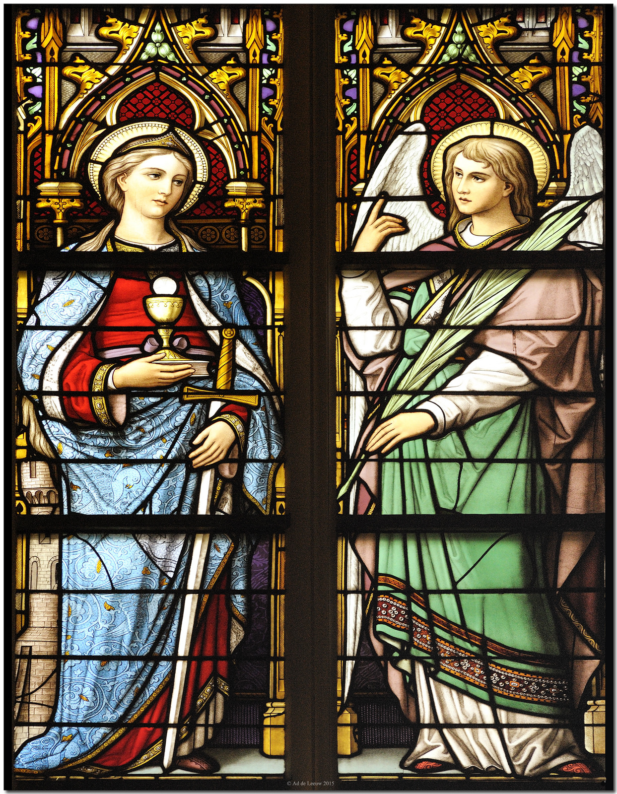 Plebaan Cornelius Norbertus van Amelsfoort liet de beglazing in het middelste raam van de Vincentius- of Charistaskapel aanbrengen. Onder in dit venster is dat duidelijk leesbaar vermeld: Ex munificentia plurimum Rev.di D.ni Cornelii Norberti van Amelsfoort hujus ecclesiae ab anno 1865-1874 plebani. De hoofdvoorstelling van het raam wordt gevormd door de figuren van de heilige Barbara en een engel die haar de martelaarspalm aanbiedt. Barbara, in de linker raamhelft, heeft als attributen in haar rechterhand de kelk met hostie, in de linkerhand het zwaard en rechts achter haar de toren. In de neogotische architectuur boven Barbara en de engel bevinden zich nog vier bazuinblazende engelen. Ter weerszijden van het Barbaravenster zijn in deze kapel mozaiekramen geplaatst, die op schilden respectievelijk de opschriften Anno Domini 1869-1897 (links) en MvA 1855 en CvA 1895 (rechts) tonen, ongetwijfeld verwijzend naar de familie Van Amelsfoort. Het raam is linksonder gesigneerd en gedateerd: L.C. Hezemens invt J.B. Capronnier delt et pinxit 1880. De vensters in de aangrenzende, buitenste straalkapel aan de zuidzijde van het koor, zijn niet met voorstellingen gedecoreerd. Wel werden er wapenschilden van de schenkers in opgenomen, te weten Jonkheer Josephus Maria Wilhelminus Emmanuel de la Court (1840-1907) en Maria Antoinette Julie Clémence Ghislaine Béthune: 1 op zilver een gouden dwarsbalk, vergezeld boven en beneden van negen zwarte hermelijnstaarten (5-4), beladen met een vijfpaarlige kroon en als helmteken een uitkomende wildeman met een zilveren schild in de rechterhand en een knots over de schouder in de linkerhand (De la Court); 2 op zilver drie blauwe vijfpuntige sterren en een blauw schildhoofd beladen met een zilveren stedenkroon van drie tinnen (Béthune).