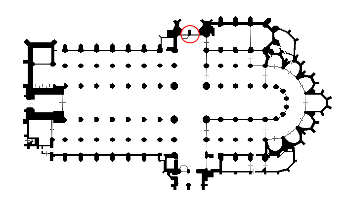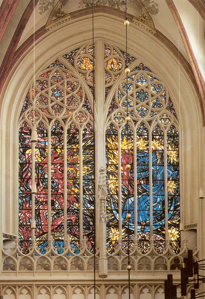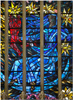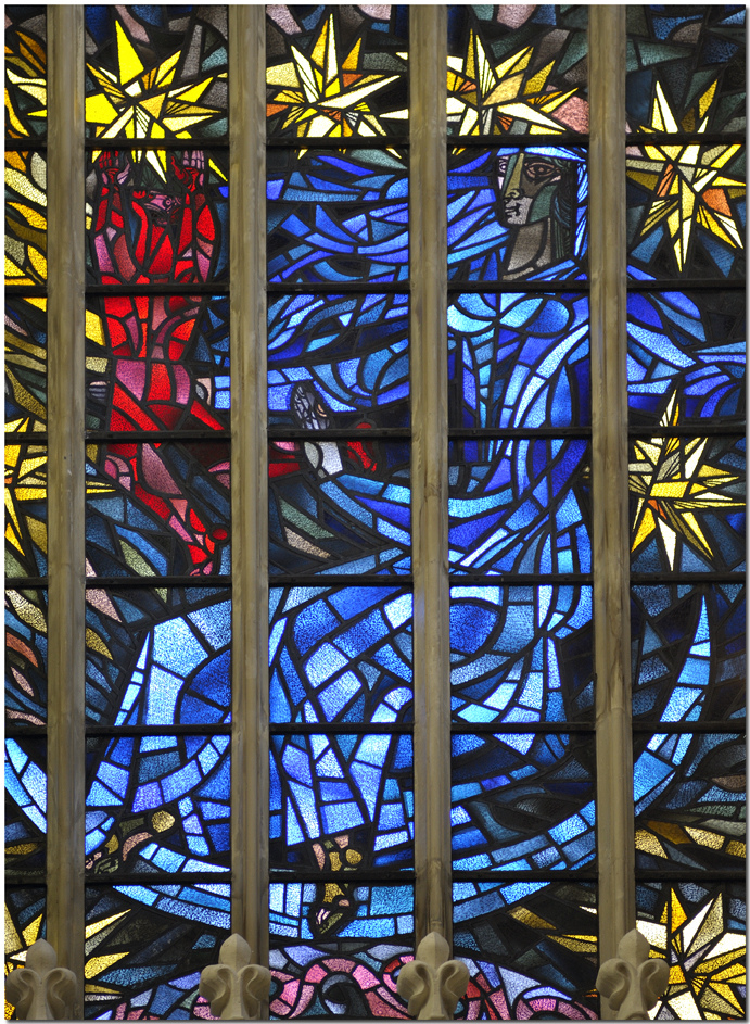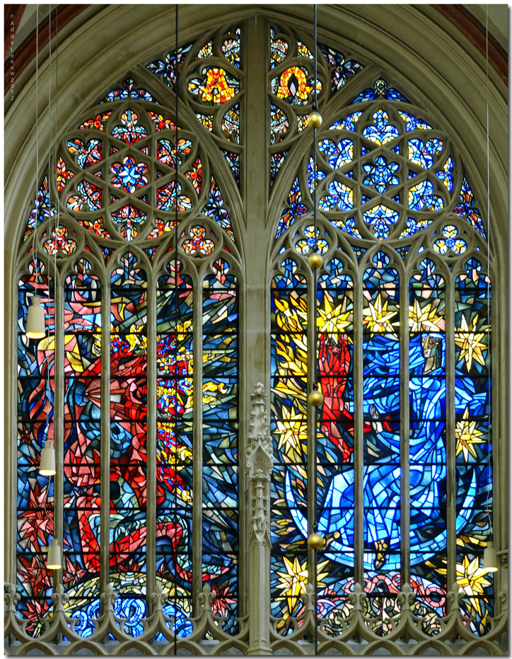 'En er verscheen een groot teken aan de hemel: een vrouw bekleed met de zon, de maan onder haar voeten en op haar hoofd een kroon van twaalf sterren ... Toen verscheen aan de hemel een ander teken: een grote vuurrode draak. Hij had zeven koppen, en tien hoorns, en op elke kop een diadeem': aldus Johannes in zijn Openbaringen, verslag gevend van zijn visioen waarin de Vrouw - 'zij was zwanger en kreet in haar weeën'- staat voor Maria in verwachting van de Verlosser, en Zij wordt geconfronteerd met het kwaad en verderf dat ze met behulp van de Aarde overwon. Dit onderwerp is op verzoek van plebaan Van Suzante gevisualiseerd in het nieuwe glas-in-lood-raam van het noordtransept. De glazenier Marius de Leeuw kreeg de opdracht en in 1966 is het glas in het oude gotische traceerwerk gemonteerd. Boven de vuurrode draak en de felblauwe Vrouw staan de eerste en laatste letter van het griekse alfabet, Alpha en Omega, ter symbolisering van het begin en het einde der tijden. Het neogotische venster dat in de vorige-eeuwse beglazingscampagne op deze plaats was aangebracht, werd op 26 october 1944 door een granaatinslag volledig vernield. Dat gebrandschilderde raam was in 1865 geplaatst op kosten (f 7000,-) van het kerkbestuur zelf volgens besluit van 5 october 1864. Afkomstig uit het atelier A.M. Schmitz te Aken en uiteindelijk als de meeste vensters ontworpen door L.C. Hezenmans, waren hier in het noordtransept de Geboorte van Christus en de Aanbidding der Koningen voorgesteld. In 1931 schreef de Bossche archivaris Jan Mosmans sarcastisch over dit neogotische raam: '... van Deutsche factuur ...en reeds charmant aan 't oxydeeren'. De wapenschilden in de onderste vakken van dit brede venster waren de volgende: