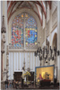 23. Het grote glas in de noordgevel van het transept werd op 26 october 1944 door granaatinslag in de oostelijke traptoren van dit transept geheel vernield. Het was een product van het atelier A.M. Schmitz te Aken uit 1865 en beeldde de Geboorte van Christus en de Aanbidding der Koningen uit. Tot plaatsing van dit glas op eigen kosten had het kerkbestuur op 5 october 1864 besloten en een commissie zag toe op de keuze van de wapenschilden en op de kosten die op 25 januari 1865 op ƒ 7.000, - geraamd werden.9 De onderste vakken werden beschilderd met de wapens van de toen pontificerende paus Pius IX, van Joannes Zwijsen, de administrator apostolicus van het bisdom, van de bisschop van Haarlem, Petrus Wilmer, die als deken en plebaan der Sint Janskerk haar restauratie begonnen was, voorts de wapens van het Rijk, de Provincie en de Stad. In 1966 kwam het nieuwe gebrandschilderde glas hier ter plaatse gereed, naar een ontwerp van Marius de Leeuw te 's-Hertogenbosch, een uitbeelding van Openbaring 12:11-18 en 22. Links de zevenkoppige draak op de woeste aarde, rechts de Vrouw, gekroond, tronend op de maansikkel. In de top van het venster de letters Alpha en Omega. De gedachte voor dit raam, onheil en hel tegenover haar die de Verlosser zal baren, werd ingegeven door de toenmalige plebaan van Susante. | 328 |