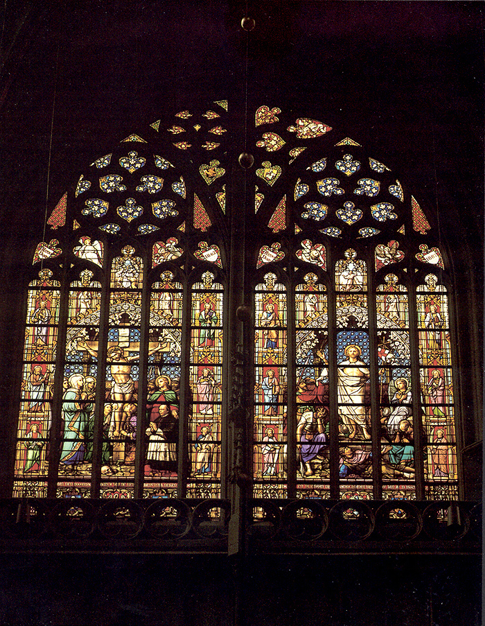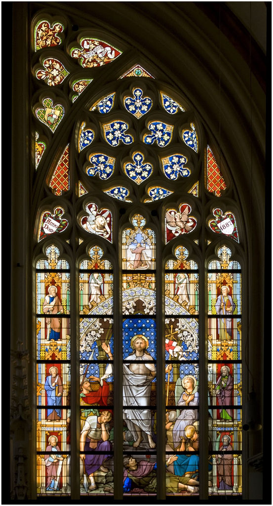Het brede venster in de geveltop van de zuidelijke transeptarm werd in 1887 aangeboden aan plebaan W. van de Ven ter gelegenheid van zijn zilveren priesterfeest, gevierd op 4 november van dat jaar. Een speciaal opgerichte commissie had gelden ingezameld onder de parochianen en behalve het grote gebrandschilderde raam kon zij de jubilerende plebaan tevens als geschenk aanbieden dat de voetstukken en baldakijnen tegen de binnenzijde van de transeptgevel werden gerestaureerd door H.P. van Nunen en dat daar nieuwe beelden voor werden gemaakt door H. van der Geld (zie: 125 Heiligenbeelden in de St.Janskathedraal te 's-Hertogenbosch, 's-Hertogenbosch 1984, nr. 52, 53, 54). Het transeptvenster is in feite verdeeld in twee gebrandschilderde ramen. In het linker venster is de Kruisiging het hoofdonderwerp, rechts de Verrijzenis. Beide scènes zijn geplaatst onder een rijk versierde neogotische spitsboog en worden geflankeerd door tweemaal drie in nissen boven elkaar geplaatste apostelen. Boven de Kruisiging is als Oudtestamentische typologie de voorstelling aangebracht van Abraham die op het punt staat zijn zoon Isaac te offeren doch door de engel wordt weerhouden; iets lager op de spitsboog staan twee engelen met de lijdenswerktuigen. Boven de Verrijzenis is het Oudtestamentische type voor deze gebeurtenis weergegeven, Jonas die na drie dagen door de walvis wordt uitgespuwd. Aan beide kanten van deze scène staat een engel met zegepalm en kroon. Verdeeld over beide raamhelften zien we vervolgens de vier evangelistensymbolen, van links naar rechts: de engel voor Mattheus, het rund voor Lucas, de leeuw voor Marcus en als laatste de adelaar voor Johannes. Naast de eerste twee lezen we nog Anno - 1862 en bij de twee andere Anno - 1887, respectievelijk het jaar waarin plebaan Van de Ven priester werd gewijd en het jaar van zijn jubileum. Hoger in de geveltop zijn nog twee wapens aangebracht: links dat van het bisdom, op zwart een naar rechts vliegende adelaar met een inktkoker in de bek; rechts dat van de St.Janskathedraal, de evangelist Johannes met pen en boek op een gouden schild. Onder de scènes van de Kruisiging en de Verrijzenis staat over de twee raamhelften de volgende tekst: aan den hoogeerw. heer W. van de Ven kanunnik deken / en plebaan de parochianen van St.Jan anno 1887. De jubilaris zelf werd afgebeeld in de Kruisigingsvoorstelling: rechts op de voorgrond zit hij geknield op een rood kussen aan de voet van het kruis, Johannes staat vlak achter hem. De zes wapenschilden langs de onderrand tonen symbolen van het priesterschap en van de erboven afgebeelde scènes. Onder de Kruisiging is dit de pelikaan die zijn jongen voedt met eigen bloed, geflankeerd door kelk en kruis; onder de Verrijzenis is het de pauw als symbool voor de eeuwigheid en de onsterfelijkheid, tussen het evangelieboek en de priestersstool. Beide raamhelften zijn respectievelijk linksonder en rechtsonder door L.C. Hezenmans en J.B. Capronnier gesigneerd.