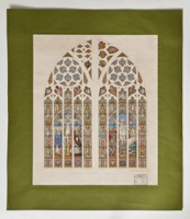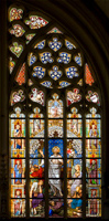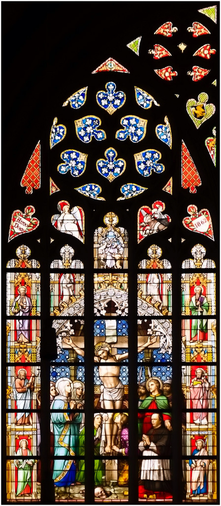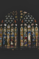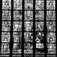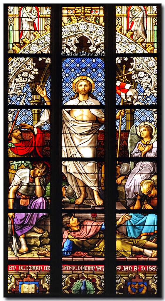25. Het grote zuidelijke transeptvenster heeft als hoofdthema's de Kruisiging en de Verrijzenis des Heren, beide gevat in een brede rand waarin de Twaalf Apostelen en hun attributen. Aan de voet van het kruis is, in het gezelschap van Maria en Johannes, in knielende houding een portret gegeven van deken-plebaan W. van de Ven in kanunniksmantel en rochet. Boven de Kruisiging is het Offer van Abraham afgebeeld, boven de Verrijzenis hoe Jonas door de walvis op het strand geworpen wordt. Daarnaast de evangelistensymbolen en hogerop de wapens van het bisdom en de kerk. Boven de Kruisiging voorts engelen met de lijdenswerktuigen, boven de Opstanding engelen met zegepalmen en kronen. Onderlangs ter afsluiting symbolen van het priesterschap: de pelikaan met bloed haar jongen voedend, tussen kelk en kruis; een pauw (beeld der onsterfelijkheid, eeuwigheid) tussen evangelieboek en priesterstool (waarmee de eeuwigheid van het priesterschap aangeduid). Opschriften: Anno Dom. 1862 - Anno Dom. 1887 en W. van de Ven pastoor deken en plebaan van de Cathedraal van St. Jan A.D. 1887. Dit glasraam kwam tot stand als geschenk aan W. van de Ven, plebaan van Sint Jan en deken der stad, ter gelegenheid van zijn vijfentwintigjarig priesterjubileum, op 4 november 1887 gevierd. In 1886 was daartoe een commissie opgericht om gelden in te zamelen en een ontwerp te laten maken. Dat werd door L.C. Hezenmans geleverd en de uitvoering daarvan werd aan J.B. Capronnier te Brussel opgedragen, wiens geleverde werk op 10 october 1887 door de commissie werd goedgekeurd. Het kerkarchief bewaart een gecalligrafeerd gedenkboek ter gelegenheid van de aanbieding vervaardigd en voorzien van een lange lijst intekenaren. Het gedenkboek vermeldt, dat voor dezelfde gelegenheid ook de beelden aan het inwendige van het venster door H. van der Geld vervaardigd en de voetstukken en baldakijnen door H.P. van Nunen gerestaureerd werden. | 329 |