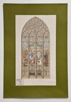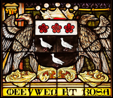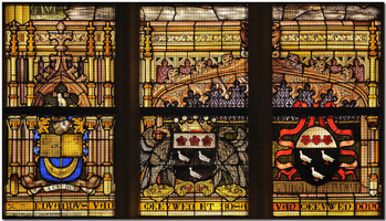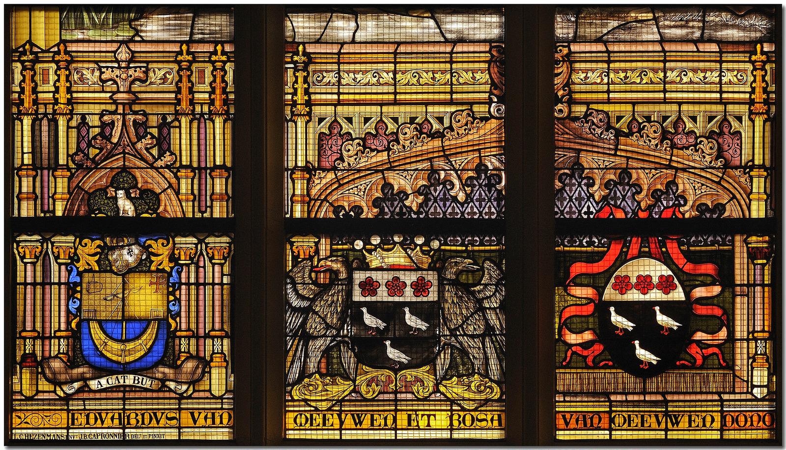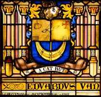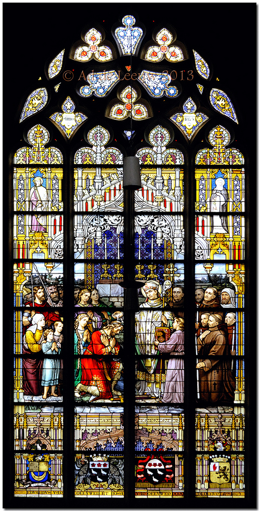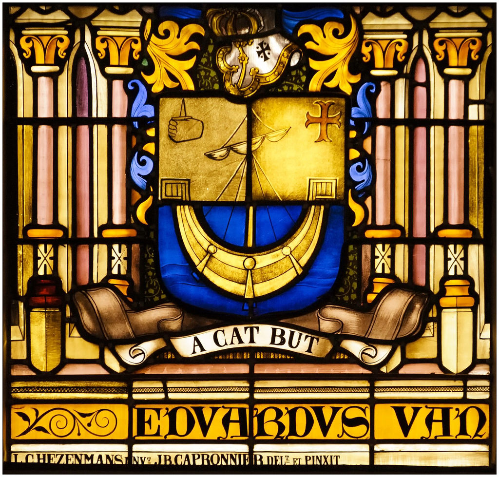 28. Het Doopsel. St. Willibrord doopt de Frank Aengilbert in 709. In baldakijnen bovenaan de H. Eduard en de H. Rosa van Lima. In de vensterkop in schilden Anno 1875. Onderaan vier wapens. 1. doorsneden van goud op blauw; over alles heen een zilveren galei met vier roeispanen naar links, op de boegspriet rechts een driehoekig vlaggetje beladen met een kruis. Op het goud rechts van de mast een zilveren hand met een zwaard paalsgewijze met de punt naar boven; links van de mast een rood klaverbladkruis; helmteken een zilveren zittende kat. Wapenspreuk a cat but, uit te breiden tot 'Touch not a cat but a glove' (Macpherson). 2. door een vijfpaarlige kroon gedekt: doorsneden, boven op zilver drie vijfbladige rode rozen; beneden op zwart drie meeuwen 2 en 1 van zilver, roodgebekt en -gepoot. Schildhouders: twee omziende, roodgetongde zwarte arenden met geopende en neerwaartse vlucht (van Meeuwen). 3. vrouwelijk wapen van Meeuwen. 4. op goud een zwarte luipaard met omgewende kop en een zilveren vrijkwartier, beladen met een rode linkerhand; op het schild een zevenpaarlige kroon, | 329 |