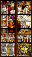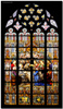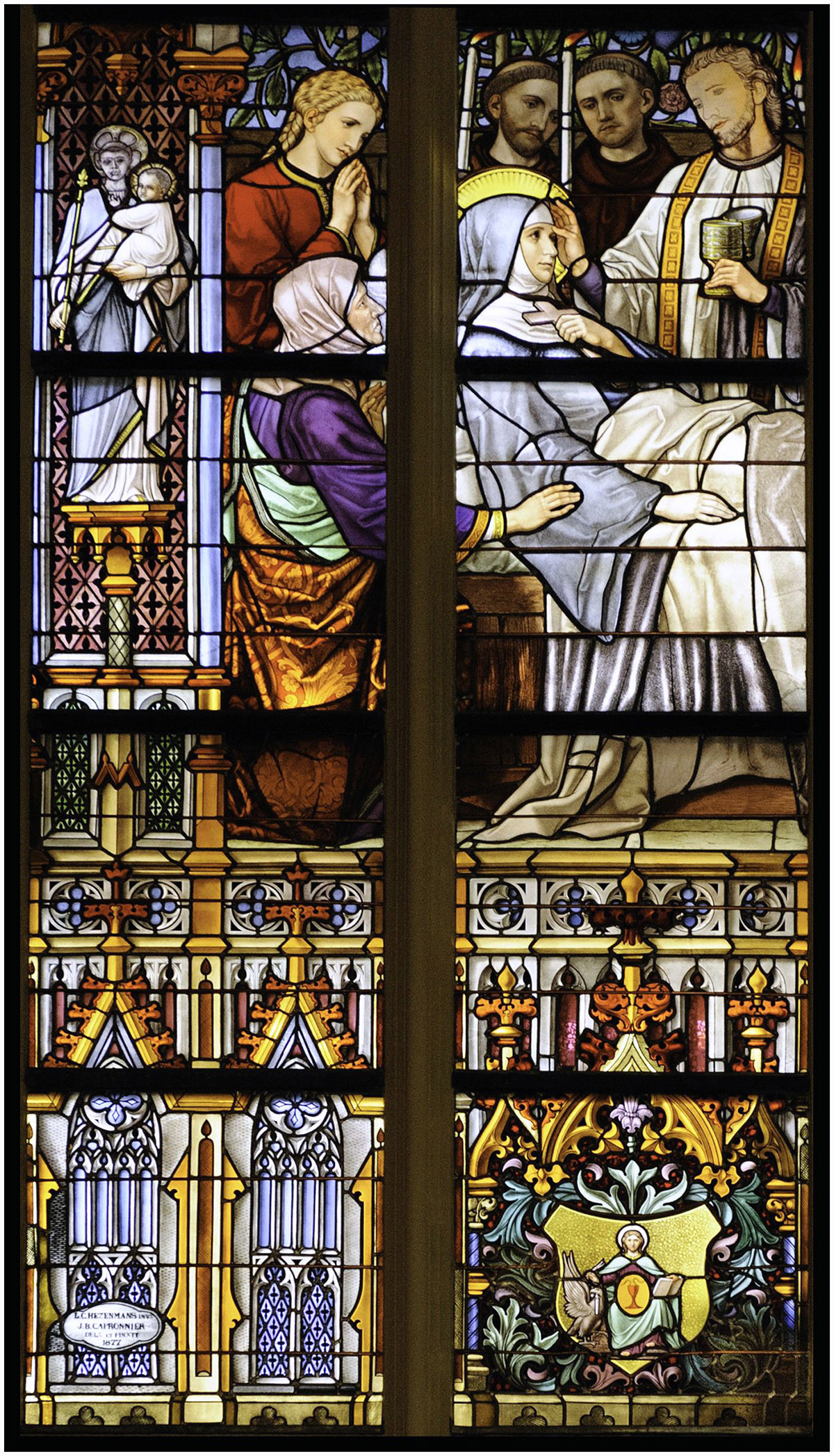 met een paars kleed waarover lichtblauwe mantel; op zijn borst een gouden schildje, beladen met een rode kelk waaruit twee slangen komen; de rechterhand rustend op de kop van een zwarte adelaar, de linker op een boek (fantasiewapen van de kerk). In de vensterkop: Anno Domini 1877. Hezenmans-Capronnier 1877. | 331 |