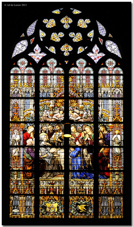 Geflankeerd door bijna en grisaille-getekende beeltenissen van Maria-met-Kind en sint Jozef, is in dit venster het Heilig Oliesel, het Sacrament der Zieken afgebeeld. Onder een breed baldakijn zweven twee engelen met een lange tekstrol waarop de aan de Brief van Jacobus (5,14) ontleende woorden: infirmatur quis in vobis inducat presbuteros et orant super eum unguentes cum oleo in nomine Domini, 'Is iemand onder u ziek? Laat hij de priesters roepen, zij moeten een gebed over hem uitspseken en hem met olie zalven in de naam des Heren'. De historische gebeurtenis uit de regionale kerkgeschiedenis die ter uitbeelding van dit sacrament werd gekozen, is het tafereel van de heilige Oda die op haar sterfbed ligt en wordt bediend. De vrome vrouw is omgeven door een groep mensen en drukt met de linkerhand een kruisbeeld tegen haar borst. Een priester, bijgestaan door enkele monniken, zalft haar voorhoofd met zijn rechterhand. De wapenschilden onder in dit raam zijn die van de St.Janskathedraa1 en van het Bossche bisdom: links op goud Johannes de Evangelist met adelaar, boek en gouden hartschild met een rode kelk waaruit twee slangen ontsnappen; rechts op zwart een gouden adelaar naar rechts met een inktkoker in de snavel. Linksonder in het venster zijn jaartal en signatuur aangebracht in een klein ovaal schildje: L.C. Hezenmans invt J. B. Capronnier delt et pinxit 1877. Op de twee banderols hoog in de venstertop is het opnieuw gedateerd: Anno Domini - MDCCCLXXVII.