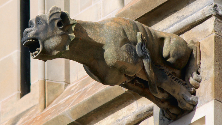 Een tweede spuwer van het torentje was bewaard op de zuidoosthoek. Hiervan bleef niet het origineel maar slechts het gipsafgietsel bewaard in de bouwloods. De spuwer heeft een monsterkop met wijd open gesperde bek, spits omhoogstaande oren, bolle ogen en dikke wenkbrauwen. Opmerkelijk is de kiewachtige drakenkraag rond de kop. In tegenstelling tot de andere spuwers aan het torentje die globaal werden gekopieerd, volgde Hezenmans bij de restauratie vrij nauwkeurig dit origineel. | 65 |
