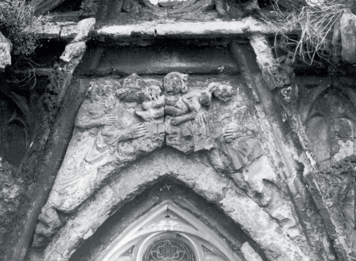 Hoewel niet veel voorkomend is het thema van de besnijdenis wel belangrijk in de Christelijke kunst, daar de gebeurtenis in direct verband wordt gebracht met de naamgeving van Jezus en omdat het bloed van de Verlosser voor de eerste maal wordt vergoten. Het tafereel speelt zich gewoonlijk af in de tempel, in aanwezigheid van de ouders. Meestal wordt het kind gedragen door Maria, en zoals Kees Peeters in 1985 al suggereerde zal met de figuur die op het reliëf achter het kind staat niet een vroedvrouw maar Maria zijn weergegeven.109 De man met de mijter stelt ongetwijfeld de priester van de tempel voor die het ritueel gaat uitvoeren. De figuur rechts is vermoedelijk Jozef, die het rituele mes aanreikt. Wie de vrouw is achter de priester blijft duister. Peeters beklaagt zich over het feit dat het voorwerp in de hand van de rechter figuur bij de restauratie ‘als een groot slachtmes is uitgelegd’, maar het mes was op het authentieke plastiek geheel bewaard gebleven en naar de oorspronkelijke proporties gekopieerd.110Het relief uit 1984, een ‘kopie’ door de gebroeders Kemperman in zandsteen, heeft het karakter van het plastiek drastisch veranderd. De veranderingen zijn legio, maar vooral de gelaatsuitdrukkingen en de haardracht van de drie figuren aan de rechter zijde vallen op. Ook het Christuskind kreeg een geheel ander hoofd. Het hoofd van de figuur uiterst rechts slaat alles wat betreft veranderingen en doet je afvragen of de beeldhouwer echt een afgietsel van het plastiek uit 1931 als voorbeeld heeft gebruikt. | 123 |