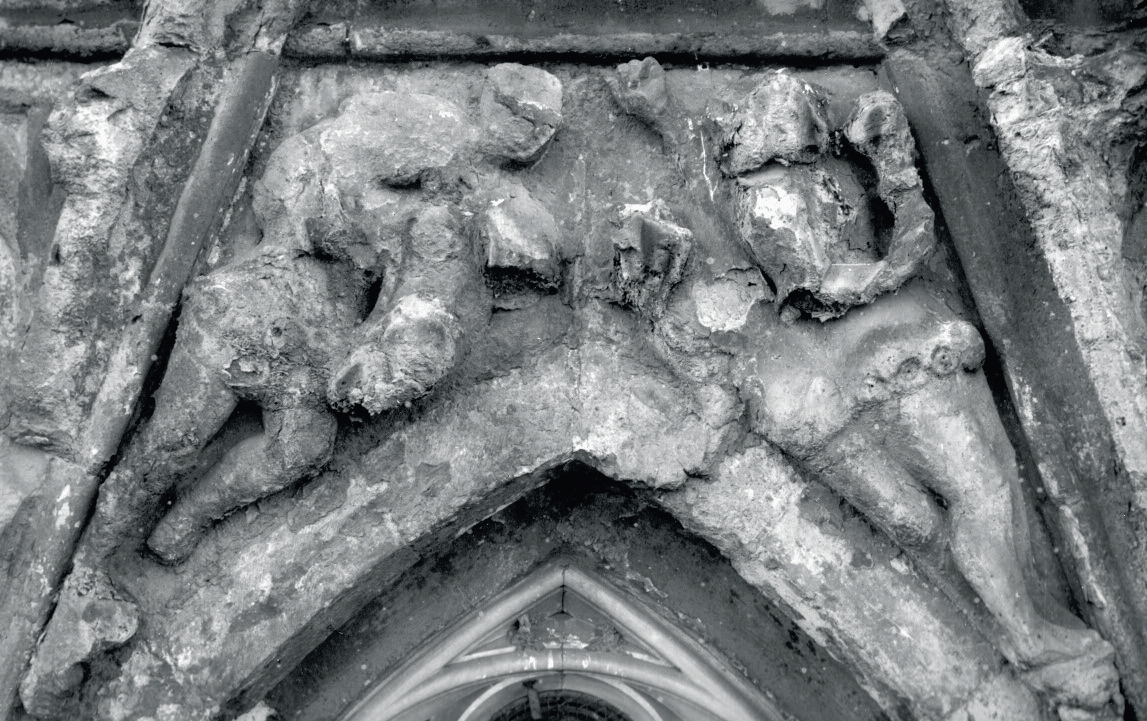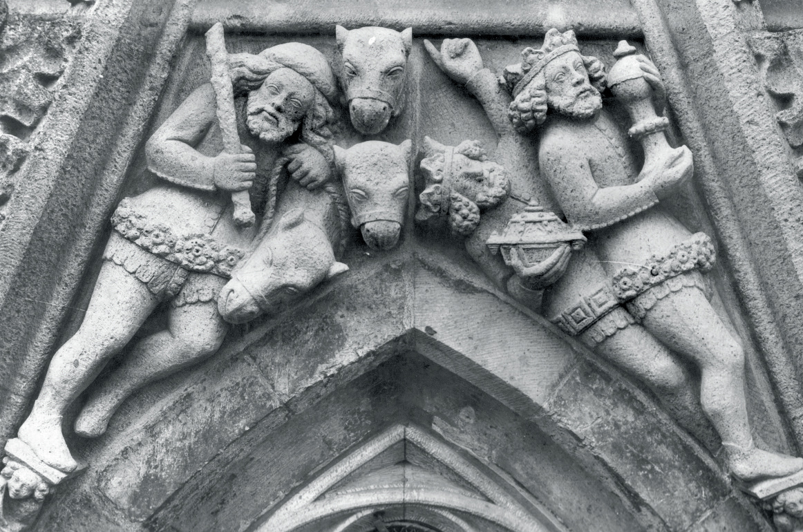 Op het zwaar verweerde reliëf waren voor de restauratie van 1931 drie figuren te herkennen. Links stond een mannelijke figuur ten voeten uit op een verweerde kraagsteen. De man droeg een lijfrok en had de linker knie wat opgetrokken, zoals karakteristiek is voor veel voorstellingen op de wimbergen omdat de figuren dan wat beter in de driehoek passen. Nog te zien was dat de man een met bloemmotieven versierde gordel droeg. Het overige van de figuur, armen en hoofd, was op enkele lange haarlokken en een stukje baard na vrijwel verdwenen en was slechts in contouren af te lezen. Rechts naast de man, nog redelijk goed herkenbaar, was de naar beneden hangende kop van een kameel zichtbaar. Een leidsel, een stuk touw, liep van de bek van het beest naar wat de leidende hand van de man zou kunnen zijn geweest. Naast deze figuren waren twee vormeloze uitsteeksels aanwezig die later als kamelenkoppen zouden worden hersteld. Het rechter deel van het reliëf toonde twee nog goed herkenbare figuren, waarvan de meest rechtse op een console in de vorm van een engel stond. De figuur droeg sierlijke puntschoenen en een lijfrok met een rijke, met bloemmotieven versierde gordel. Aan het verweerde hoofd was nog vast te stellen dat de man halflang krullend haar had en een baard. In zijn rechter hand hield hij een kelk of ciborie omhoog. De tweede figuur leek links achter de andere te staan. Ook hij droeg een lijfrok met een rijk versierde, metalen (?) gordel. De rechter arm van de figuur was afgebroken, de linker reikte, met de vinger wijzend naar boven. Van het hoofd was een deel van het gezicht met | 124 |