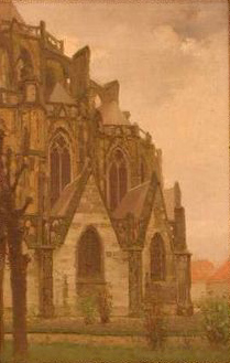 gebrandschilderde glazen van de straalkapellen uitgenomen en gerepareerd. Van de vensters werden de ijzeren brugstaven vervangen door bronzen en gescheurde montants vernieuwd. In augustus 1980 werden, om alvast het onderzoek naar de muur- en gewelfschilderingen aan te vangen, de drie zuidelijke kapellen inwendig in de steigers gezet, in maart 1981 de overige, later deelde ook de meest noordwestelijke straalkapel in dit werk, nadat daaruit in september-october het kleine orgel verwijderd was. Reeds bij de eerste reiniging kwamen decoraties uit minstens drie verschillende achtereenvolgende perioden tevoorschijn buiten de reeds zichtbare recente ensembles, onder andere van Dorus Hermsen, uit het begin van deze eeuw. In alle kapellen is tenslotte de neogotische decoratie (1894-1918) grotendeels hersteld, deels gereconstrueerd (1983-1984). | 123 |