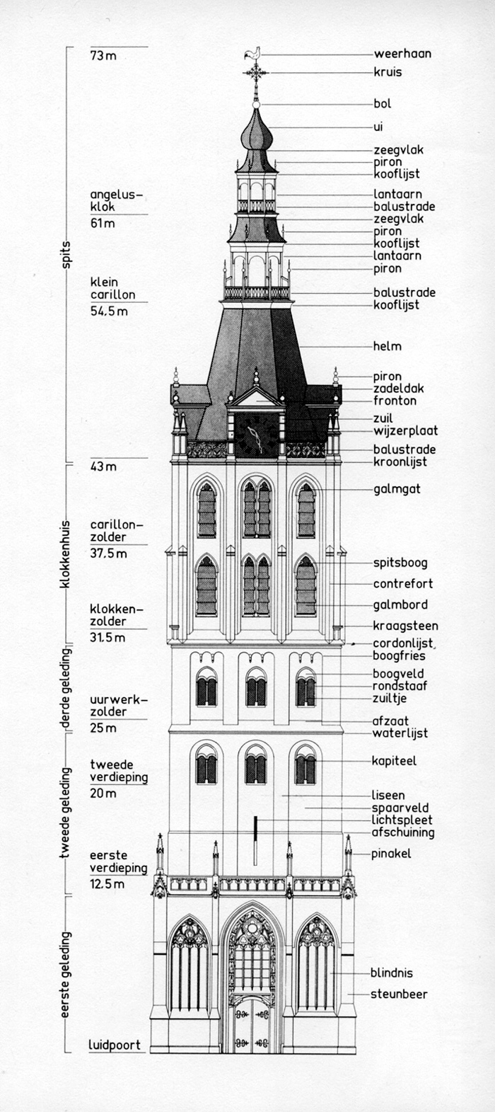 de voet van de helm, welke eveneens verwijderd werden, waarna nieuwe cijferringen tegen de bovenste torengeleding geplaatst werden. De zorg voor de bekleding van de onderbouw van de toren, de zone van het Luidportaal, werd daarentegen aan het kerkbestuur en de restauratiecommissie overgelaten en de herstelling daarvan vond eerst in 1880-1881 plaats. | 74 |