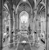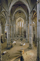 AfstandelijkDe preekstoel bleef, terwijl ook de marmeren verhogingen van zowel het hoogaltaar als het altaar van de Mariakapel waarschijnlijk te bezwaarlijk waren om te verplaatsen. 'De kansel wordt nog wel gebruikt als spreekgestoelte, maar in meer dan de helft van alle gevallen geven sprekers er de voorkeur aan de zaal vanaf het podium toe te spreken. De hoge preekstoel wordt veelal te afstandelijk bevonden.'De kooromgang achter het hoogaltaar deed vroeger dienst als sacristie. Nu zijn daar de toiletten en een grote keuken. Boven de kooromgang bevindt zich - via een krakend-oude eikenhouten trap te bereiken - eenzelfde halfronde ruimte. Vanuit deze zogeheten 'Jeroen Boschzaal' heeft men uitzicht op het middenschip van de kerk. Moderne kunst siert het oude metselwerk. Onder de kerk, en eveneens aan de achterzijde, is ook zo'n halfronde ruimte, die met al even oud metselwerk oogt als een crypte, maar in de praktijk niet meer dan een stookkelder was. Een gemetselde trap voert daarheen. Hier en daar herinnert een enkele opening aan de rookkanalen van weleer. 'Tuin der lusten' heet deze ruimte nu, intussen uitgebreid met een serre, die het zicht op de 'Jeroen Boschtuin' aanzienlijk heeft verbreed. Deze tuin, die ook bereikbaar is via Louwschepoort en In den Boerenmouw - beide intieme hofjes - is tevens stadspark en een oase van rust. Ook officieel luidt de naam Jeroen Boschtuin, getuige de straatnaambordjes van de gemeente. KarakterOndanks alle aanpassingen houdt Ferry Boerboom staande dat het karakter van de kerk onveranderd is. Het zijn nog altijd grote gotische glas-in-loodramen, die met hun specifieke lichtinval de welhaast gewijde sfeer in de Orangerie bepalen. Eikenhouten deuren met monumentale afmetingen dragen daartoe bij. Ook de buitendeuren zijn nog origineel. In het kerkportaal blijft een groot rooster een herkenbare factor.Op de pilaren in de kerk, die de bogen naar de zijbeuken accentueren, zijn vaag sporen te zien van de kleurschilderingen, die de kerk ooit nog meer glans gaven. 'De pilaren moeten fantastische kleuren hebben gehad', raadt Ferry Boerboom. Van de vroegere plafondschilderingen is hier en daar ook nog iets te bespeuren. Van de muurschilderingen zijn in de zijkapel nog enige resten te zien. De Orangerie moet het wat dit betreft tegenwoordig hebben van de permanente, maar regelmatig wisselende tentoonstelling van Barry Martens. En eens per jaar exposeert 'Het Bossche Palet', vereniging van amateurschilders, in de kerkzaal, een van de gemiddeld 175 activiteiten, die jaarlijks in de Orangerie plaatsvinden. | 103 |