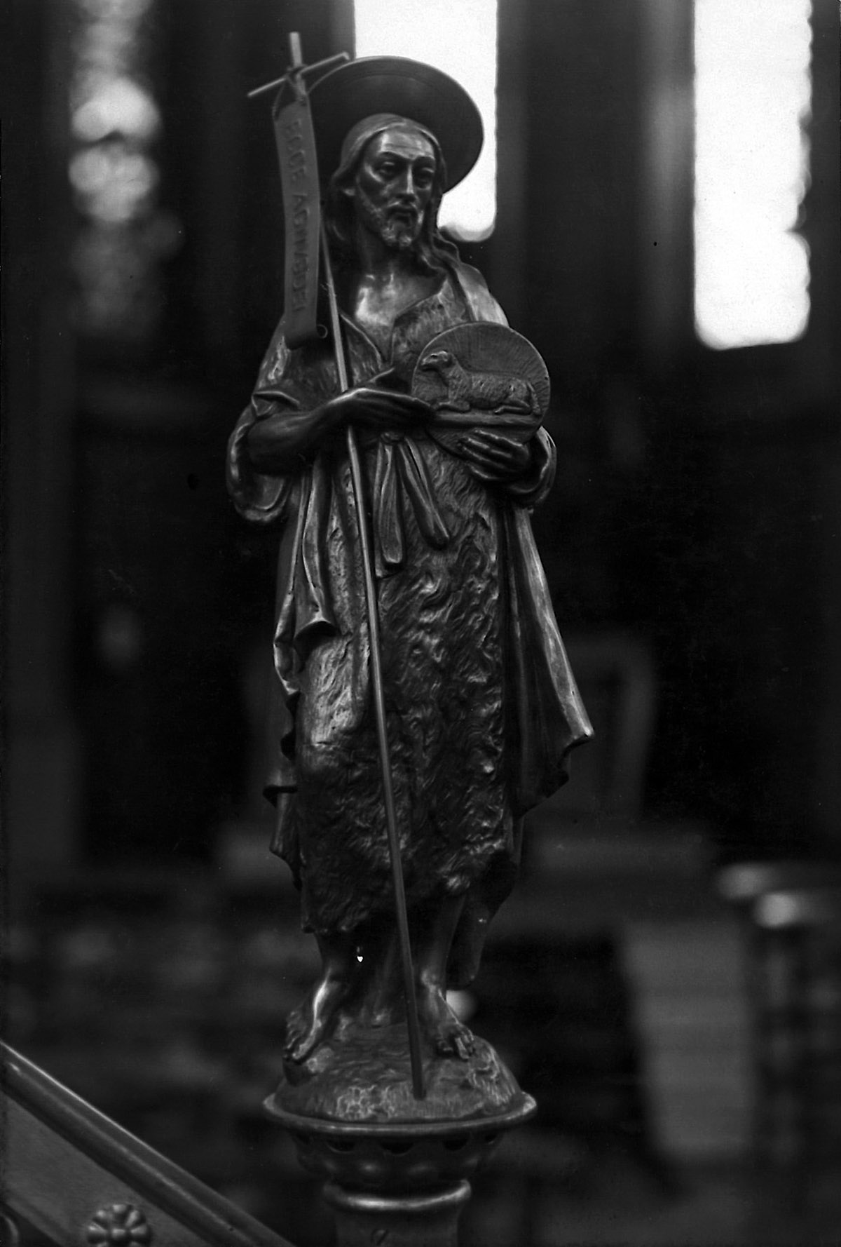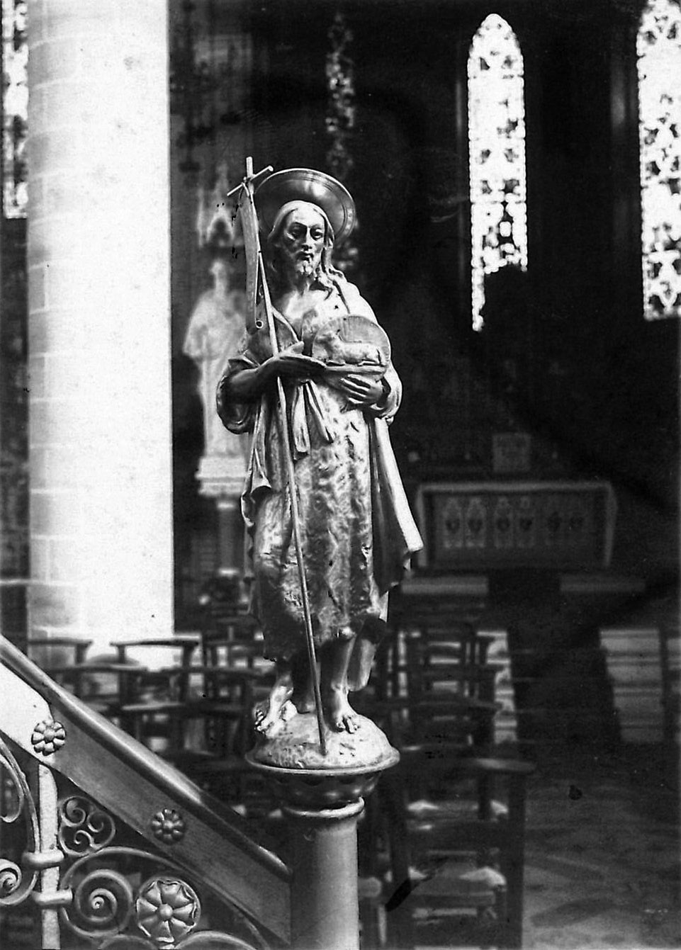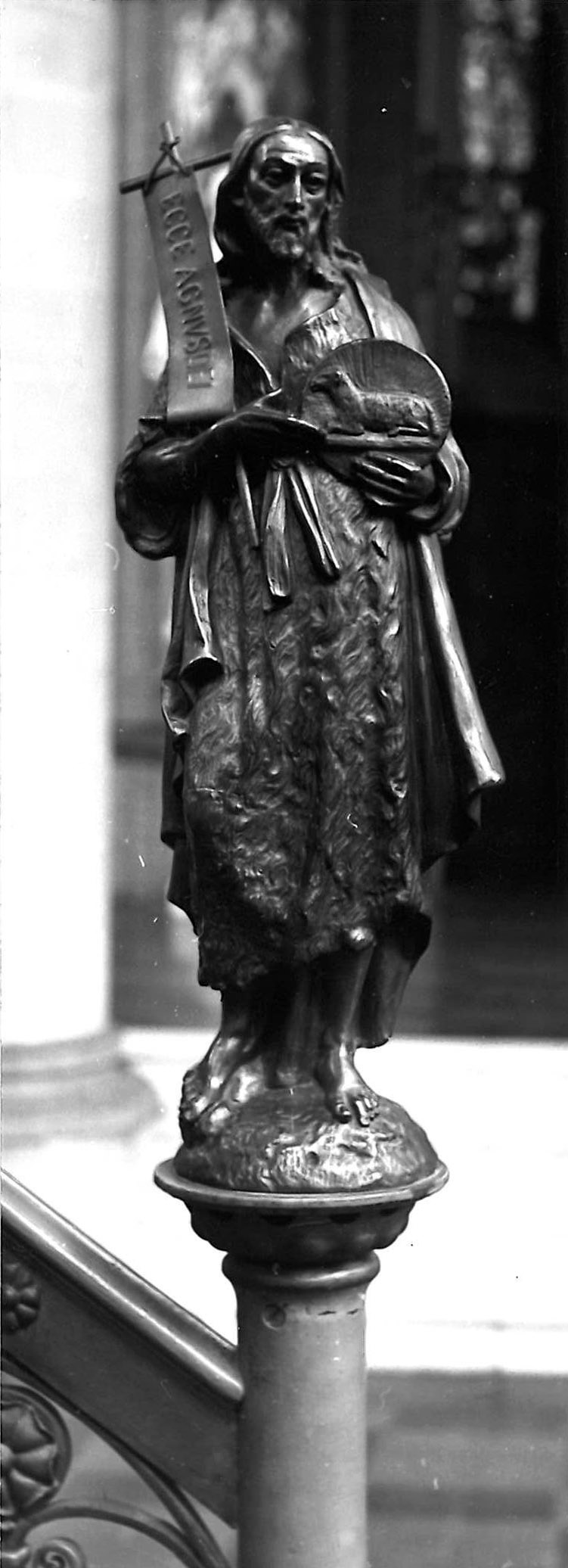 14. Marmeren preekstoel op kolom en zes zuilen met gietbronzen trap en beelden van de vier evangelisten en St. Jan de Doper incl. klankbord.