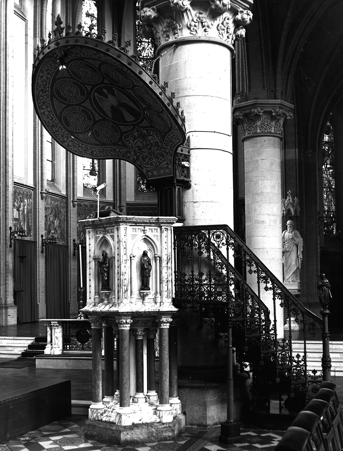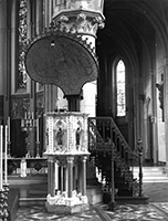 14. Marmeren preekstoel op kolom en zes zuilen met gietbronzen trap en beelden van de vier evangelisten en St. Jan de Doper incl. klankbord.
