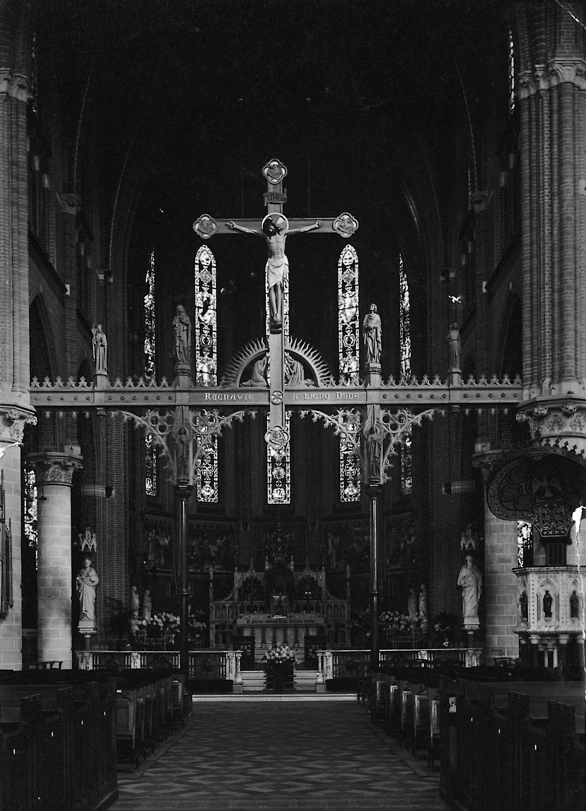 Versierd interieur van de Sint Leonarduskerk bij gelegenheid van het 25 jarig priesterfeest van pastoor Van der Kant.