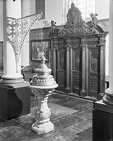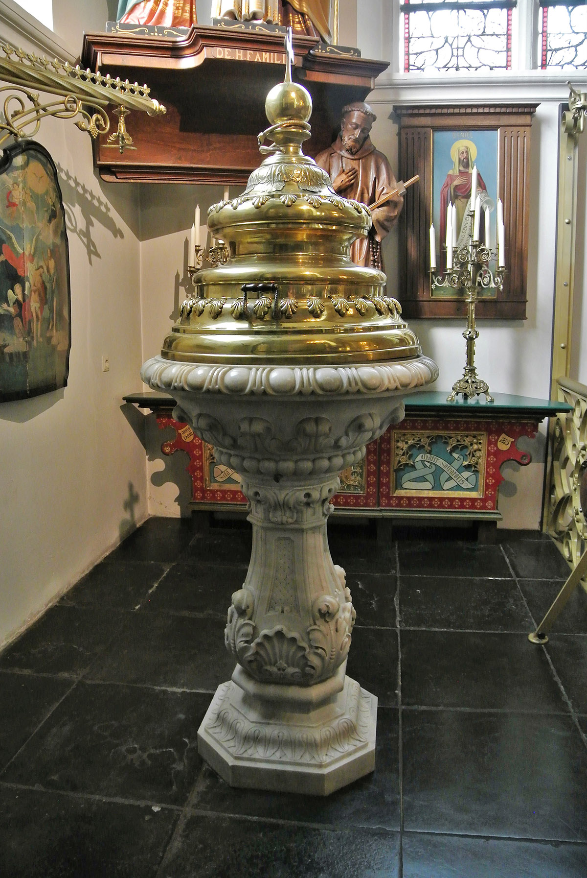 Wit marmeren bak met geelkoperen deksel, totale hoogte 275 cm (bak 116 cm, deksel opgehangen aan een draaibare arm 159 cm hoog), 1868. De vont bestaat uit een achtzijdige voet met palmettenrand, een balusterstam met acanthusblad en palmetten en de bak is versierd met parelrand, acanthusblad en eierlijst. Op het koperen deksel twee randen met opliggende palmetten en een rand van acanthusblad, het geheel bekroond met bol, slang en kruis. In het kruis is het IHS-monogram en het Lam Gods liggend op het kruis gegraveerd. Het deksel draagt de volgende inscriptie: 25-JARIGE ECHTVEREENIGING 1843 9 FEBRUARY 1868 J.F.J. VAN RIJCKEVORSEL ~ A.J.P. INGENHOUSZ. In 1972 geplaatst in de Sint-Bartholomeuskerk in Beek Ubbergen. | 50 |